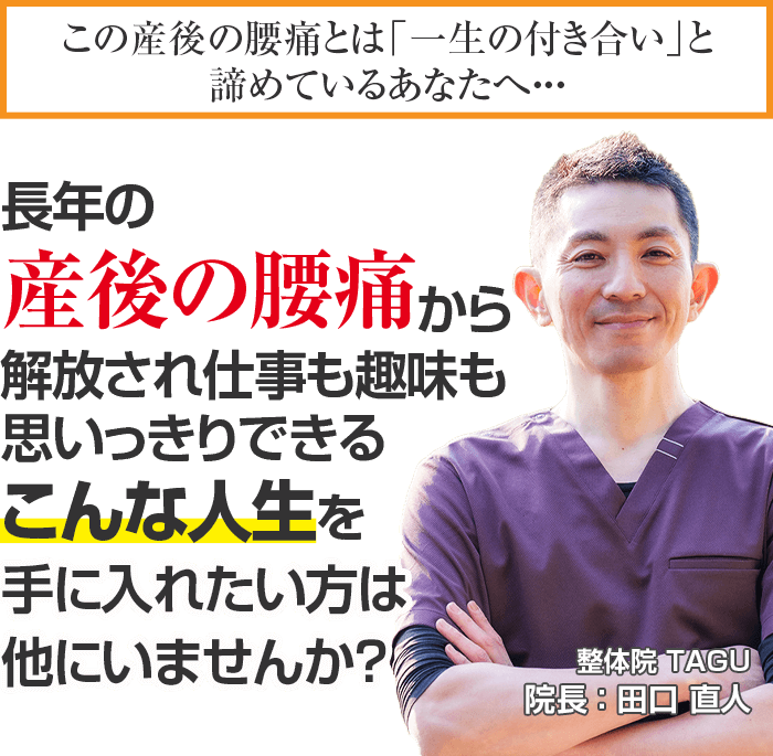 延べ13万人以上の施術実績のある国家資格者の身体のプロが施術を行い、数多くの産後の腰痛持ちのお客様から支持される草加市で唯一の産後の腰痛専門「整体院TAGU」に来院し、痛みに我慢することのない人生を手に入れる道。